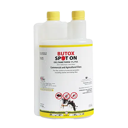 Butox Spot On is a ready to use concentration containing Deltamethrin which is a light-stable pyrethroid with potent residual insecticidal activity.